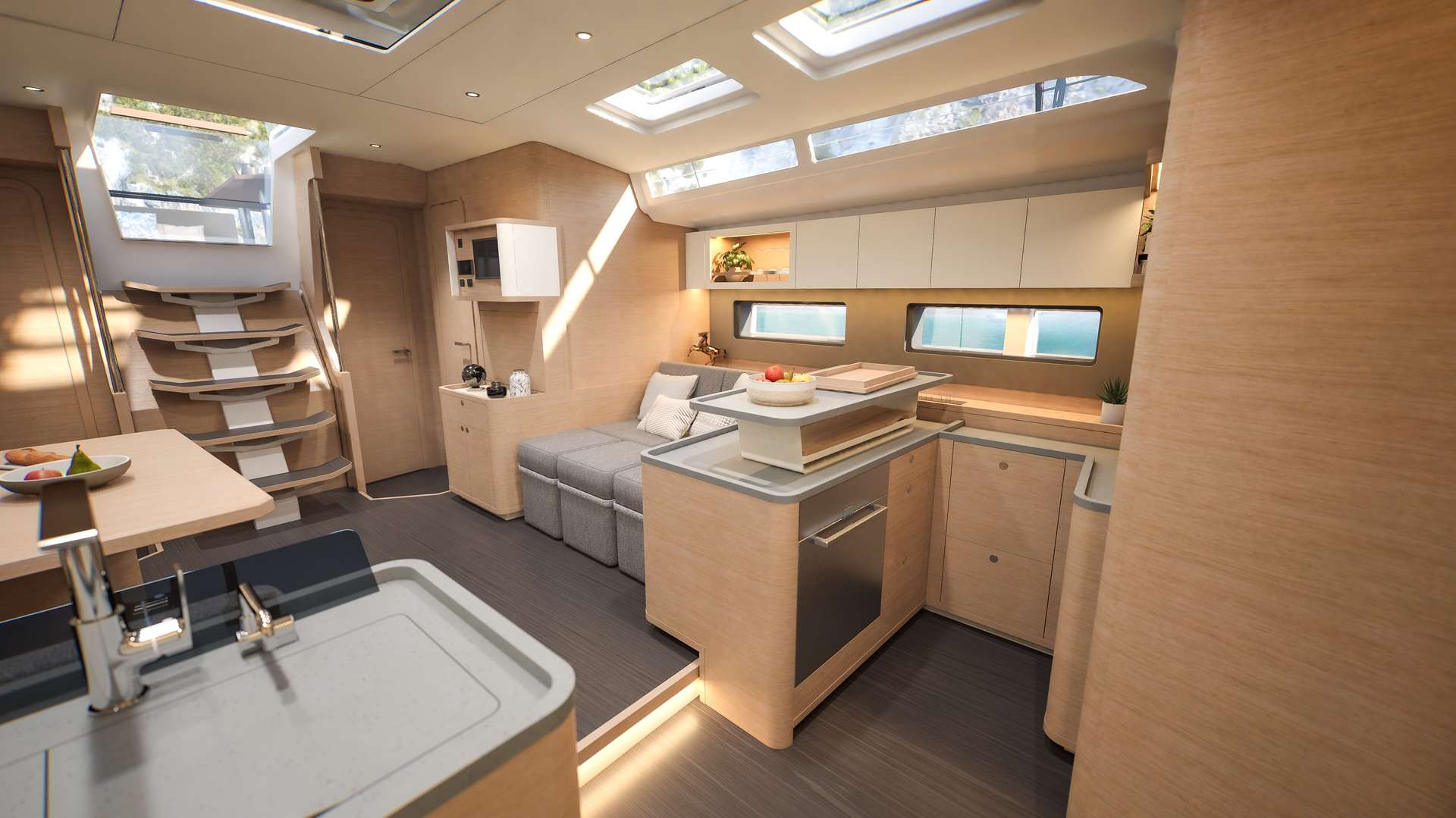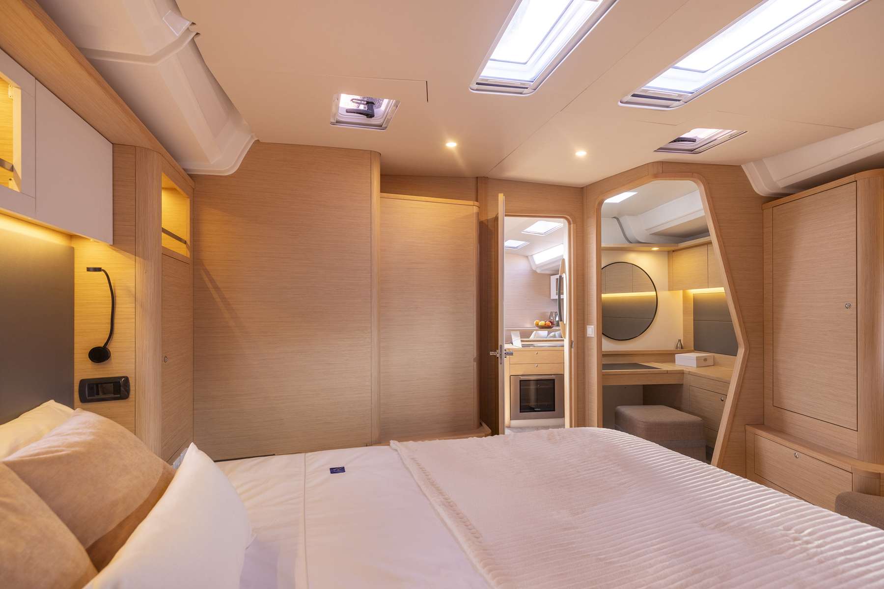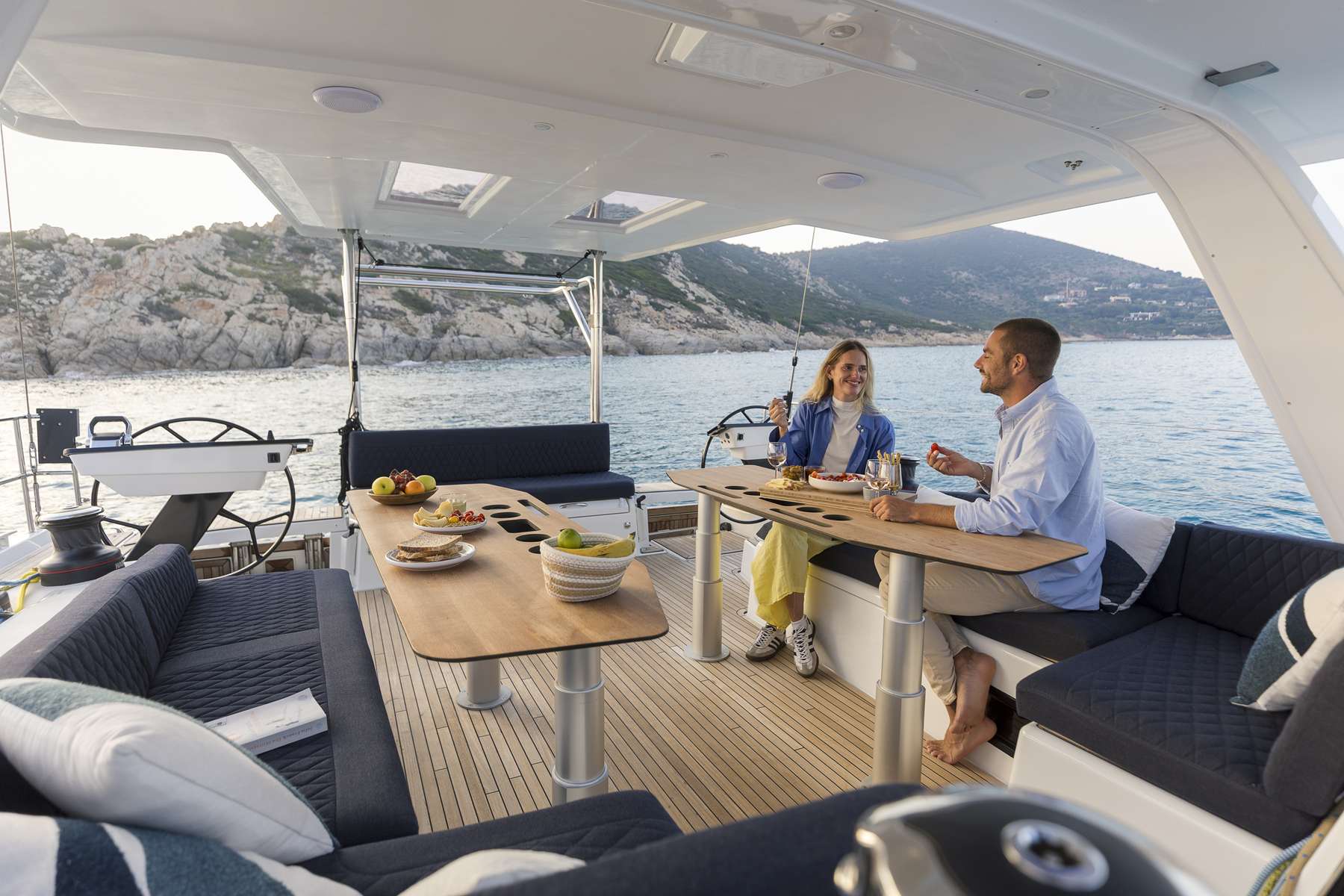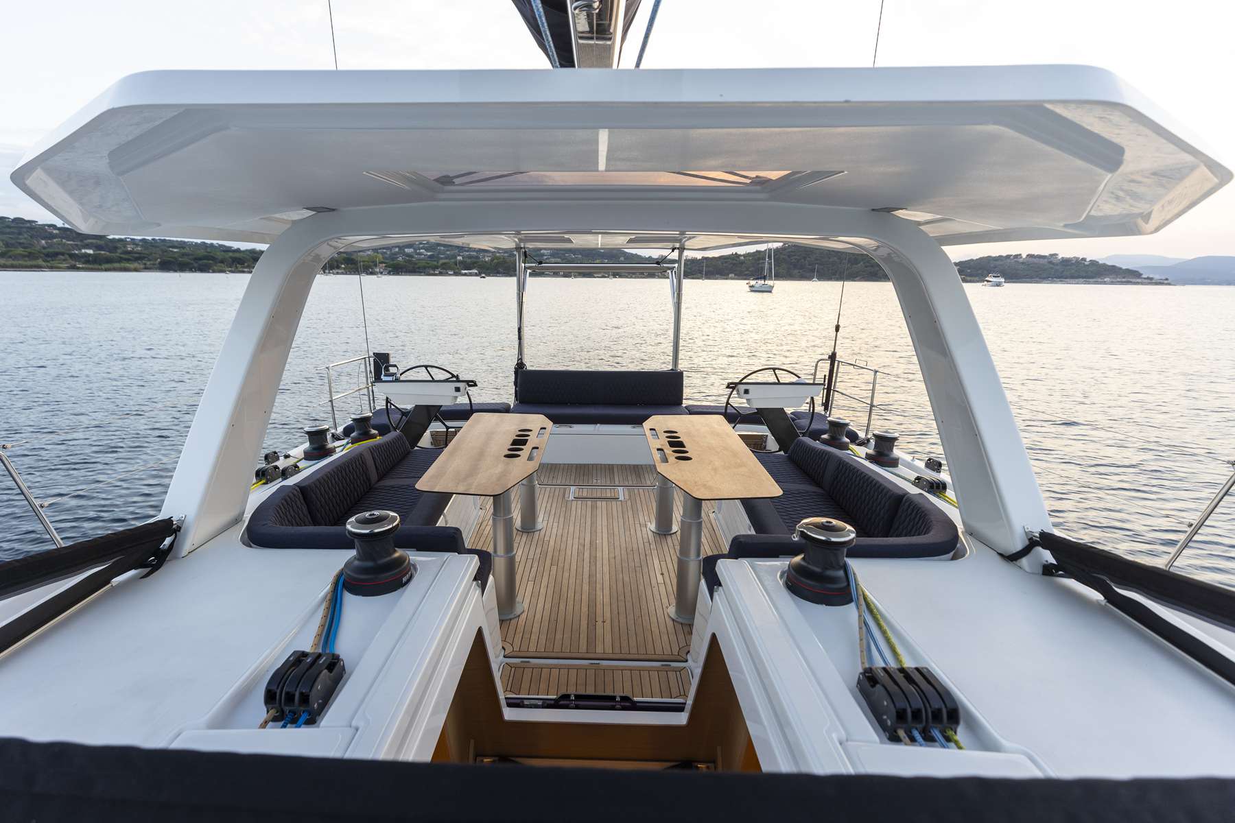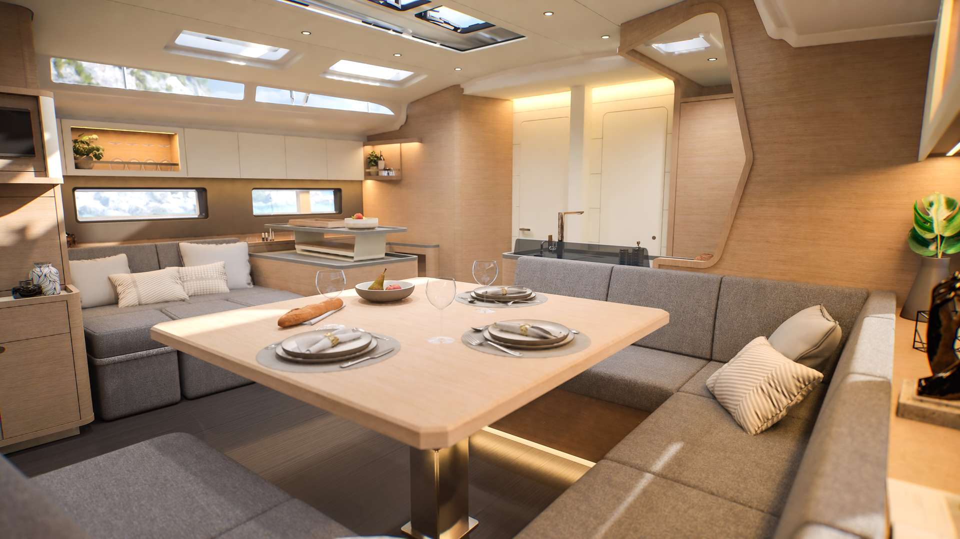 Un accent particulier a été mis sur la qualité de vie à l’extérieur avec des espaces complètement repensés pour vivre pleinement ses désirs d’escapade au grand air. Les intérieurs, eux aussi, ont été pensés pour une connexion totale avec les éléments. Les grands vitrages permettent une vue à 360° sur la mer et le ciel, où que l’on soit dans le voilier. Chaque pièce reçoit une douce et chaleureuse lumière qui rend agréables les déplacements et la vie à l’intérieur.