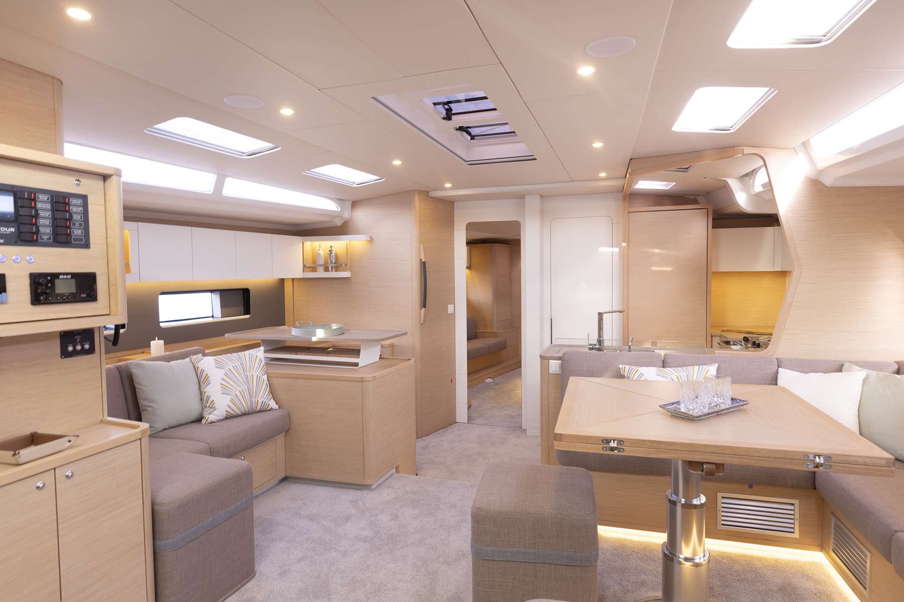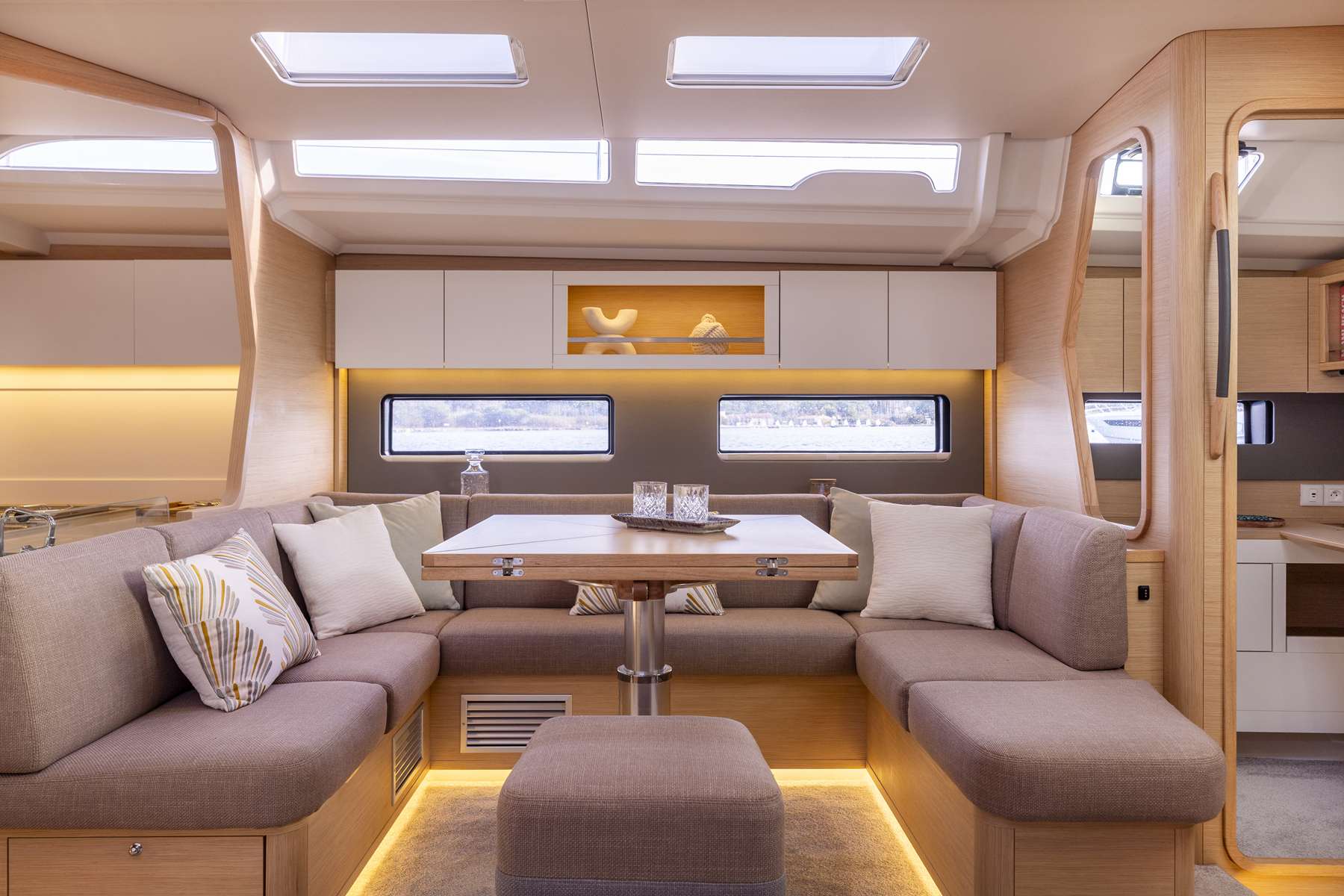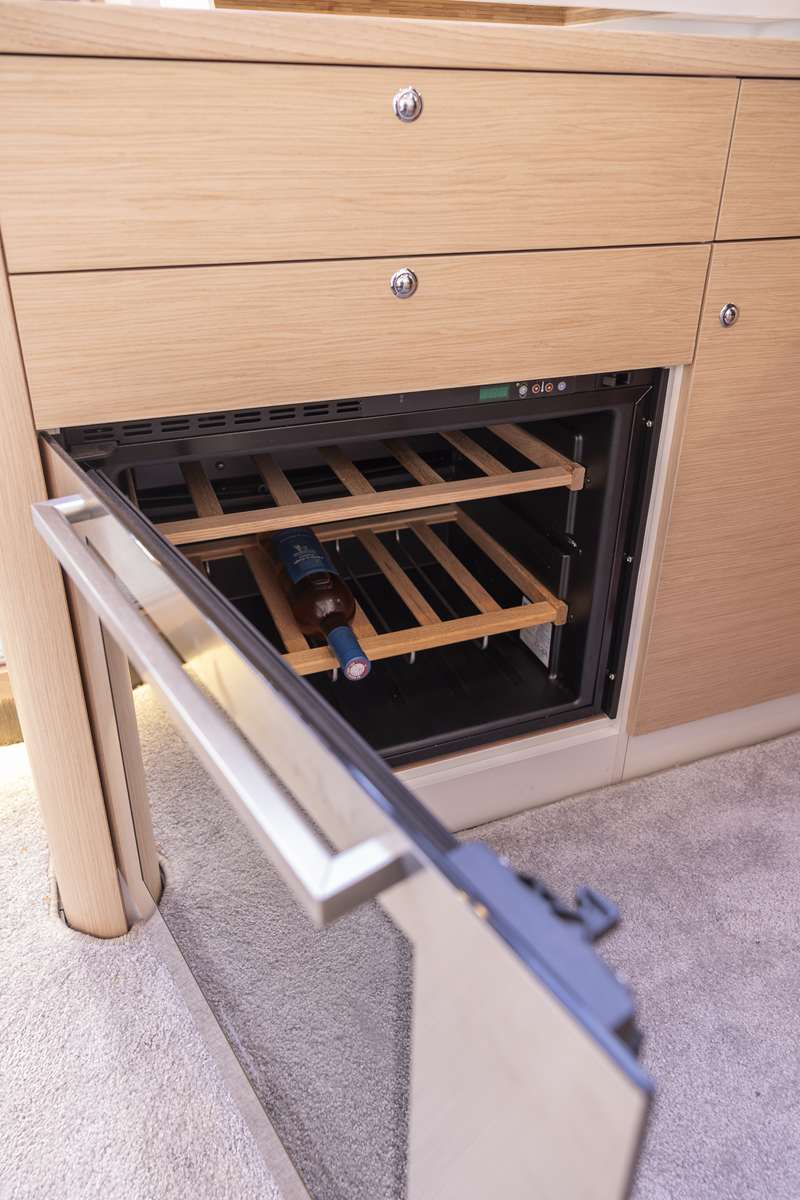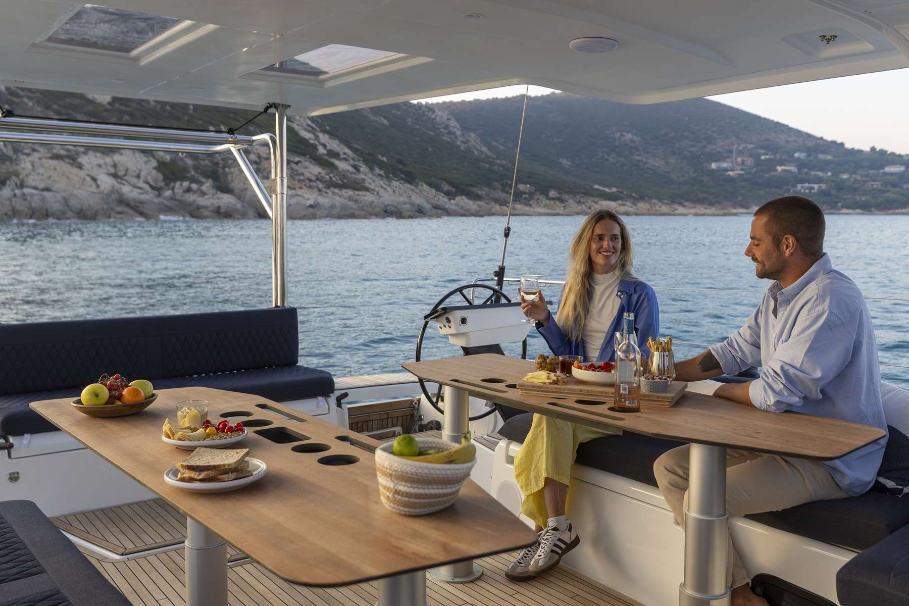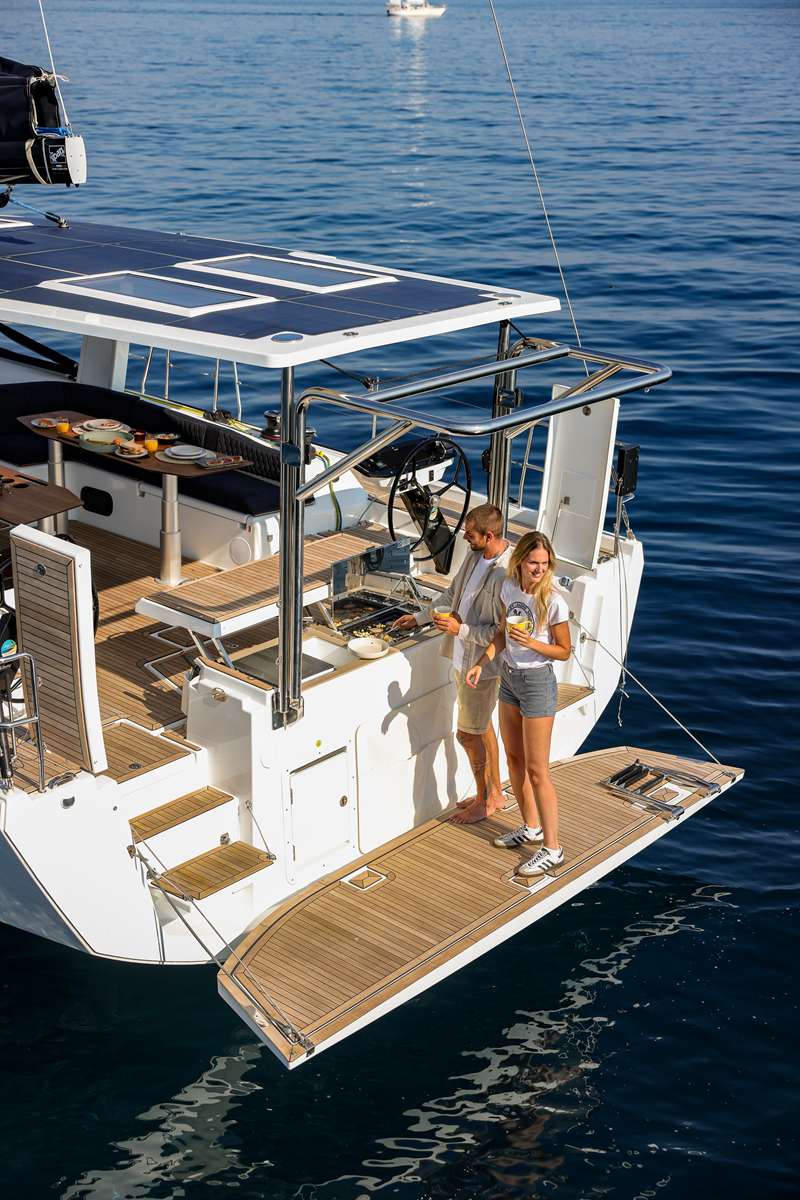 Un accent particulier a été mis sur la qualité de vie à l’extérieur avec des espaces complètement repensés pour vivre pleinement ses désirs d’escapade au grand air. Les intérieurs, eux aussi, ont été pensés pour une connexion totale avec les éléments. Les grands vitrages permettent une vue à 360° sur la mer et le ciel, où que l’on soit dans le voilier. Chaque pièce reçoit une douce et chaleureuse lumière qui rend agréables les déplacements et la vie à l’intérieur.