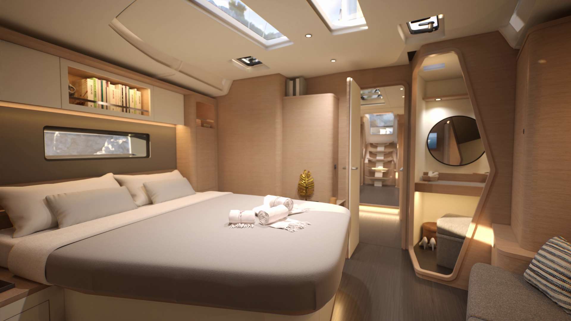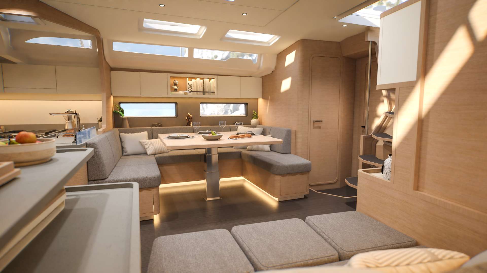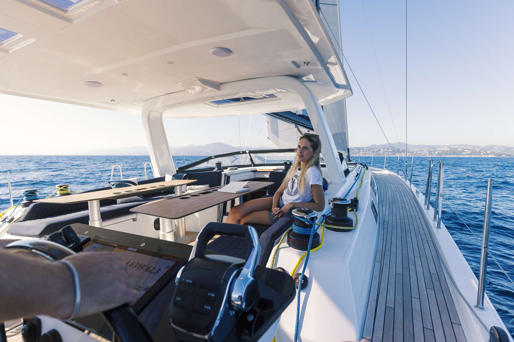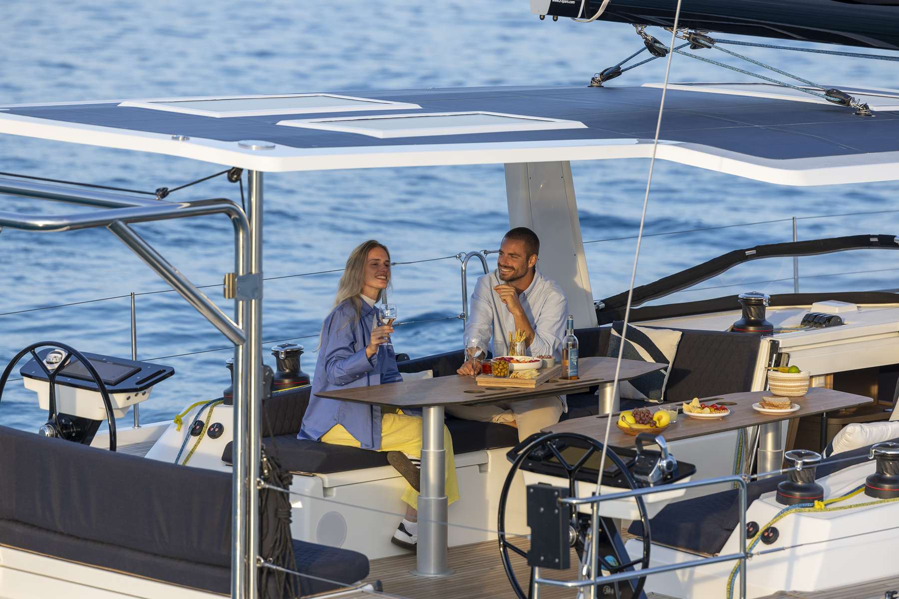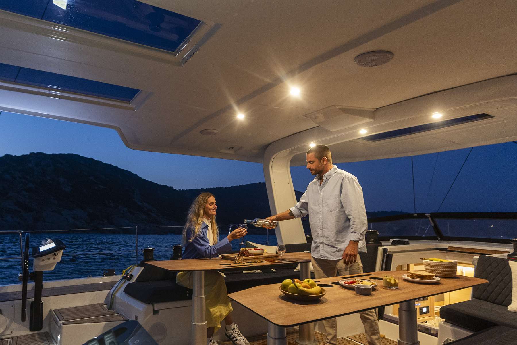 Un accent particulier a été mis sur la qualité de vie à l’extérieur avec des espaces complètement repensés pour vivre pleinement ses désirs d’escapade au grand air. Les intérieurs, eux aussi, ont été pensés pour une connexion totale avec les éléments. Les grands vitrages permettent une vue à 360° sur la mer et le ciel, où que l’on soit dans le voilier. Chaque pièce reçoit une douce et chaleureuse lumière qui rend agréables les déplacements et la vie à l’intérieur.