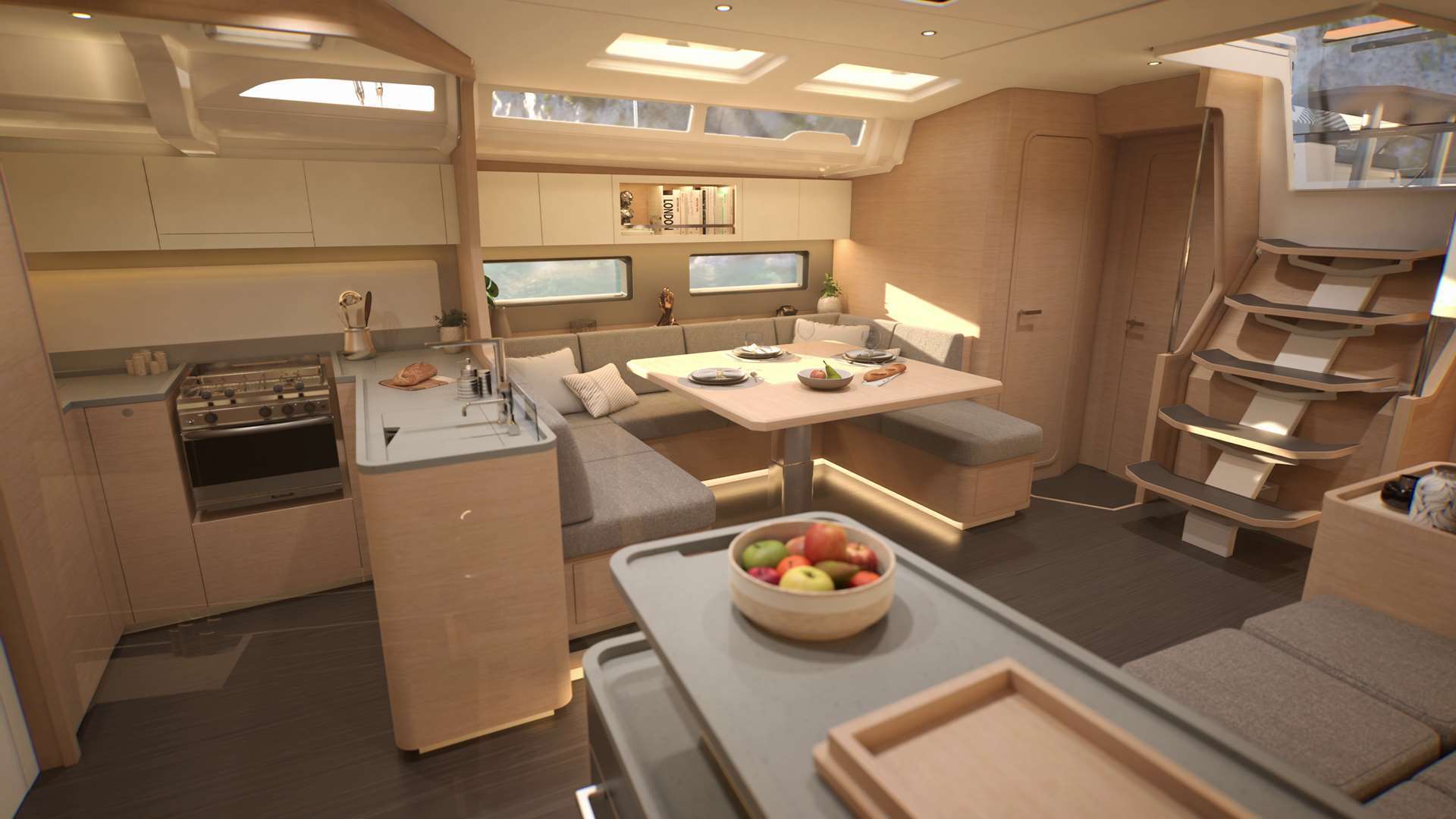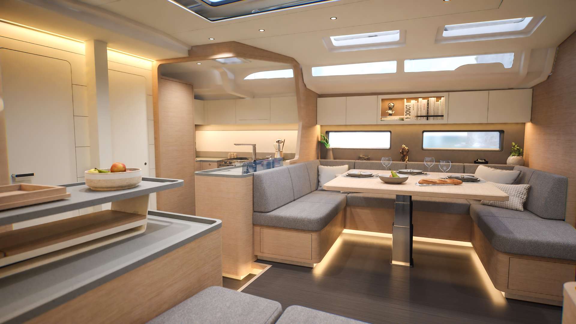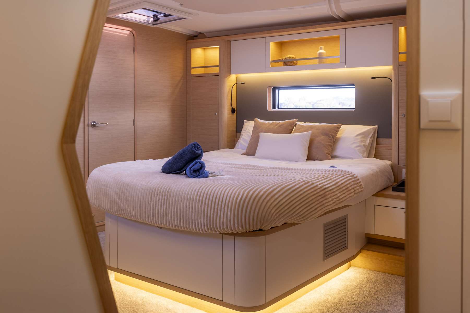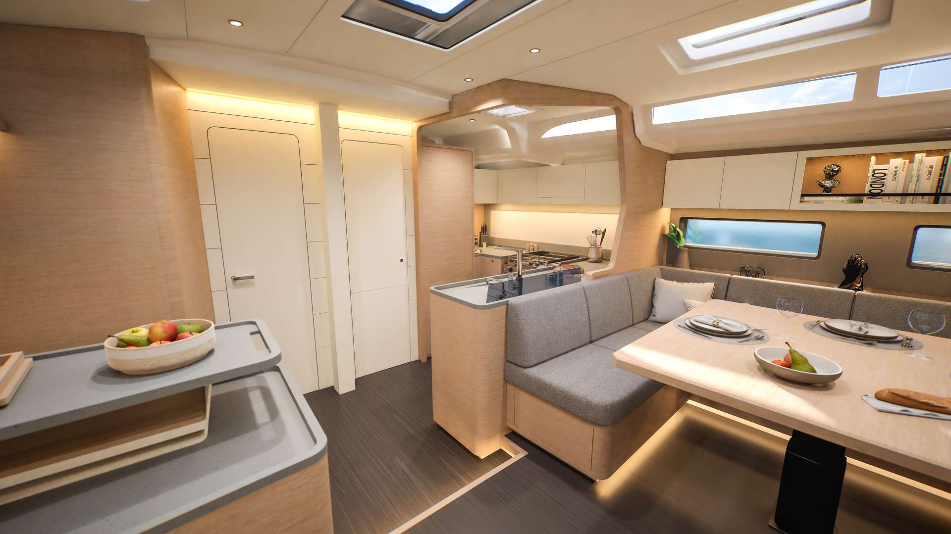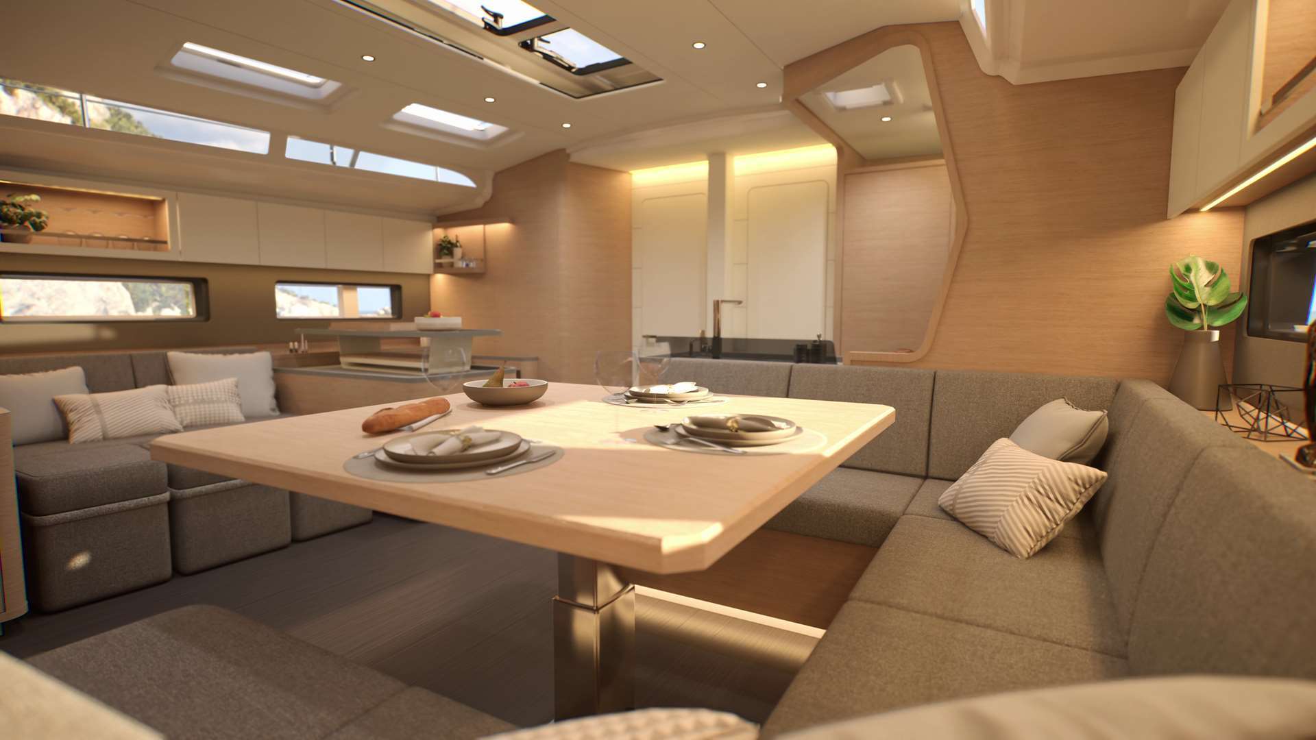 Un accent particulier a été mis sur la qualité de vie à l’extérieur avec des espaces complètement repensés pour vivre pleinement ses désirs d’escapade au grand air. Les intérieurs, eux aussi, ont été pensés pour une connexion totale avec les éléments. Les grands vitrages permettent une vue à 360° sur la mer et le ciel, où que l’on soit dans le voilier. Chaque pièce reçoit une douce et chaleureuse lumière qui rend agréables les déplacements et la vie à l’intérieur.