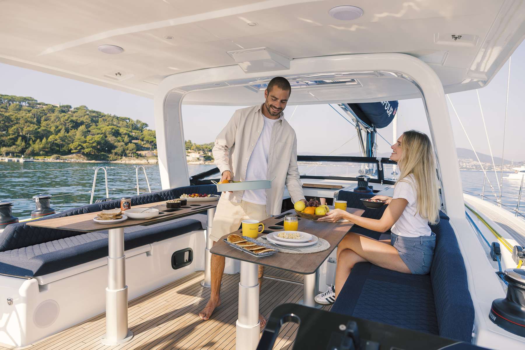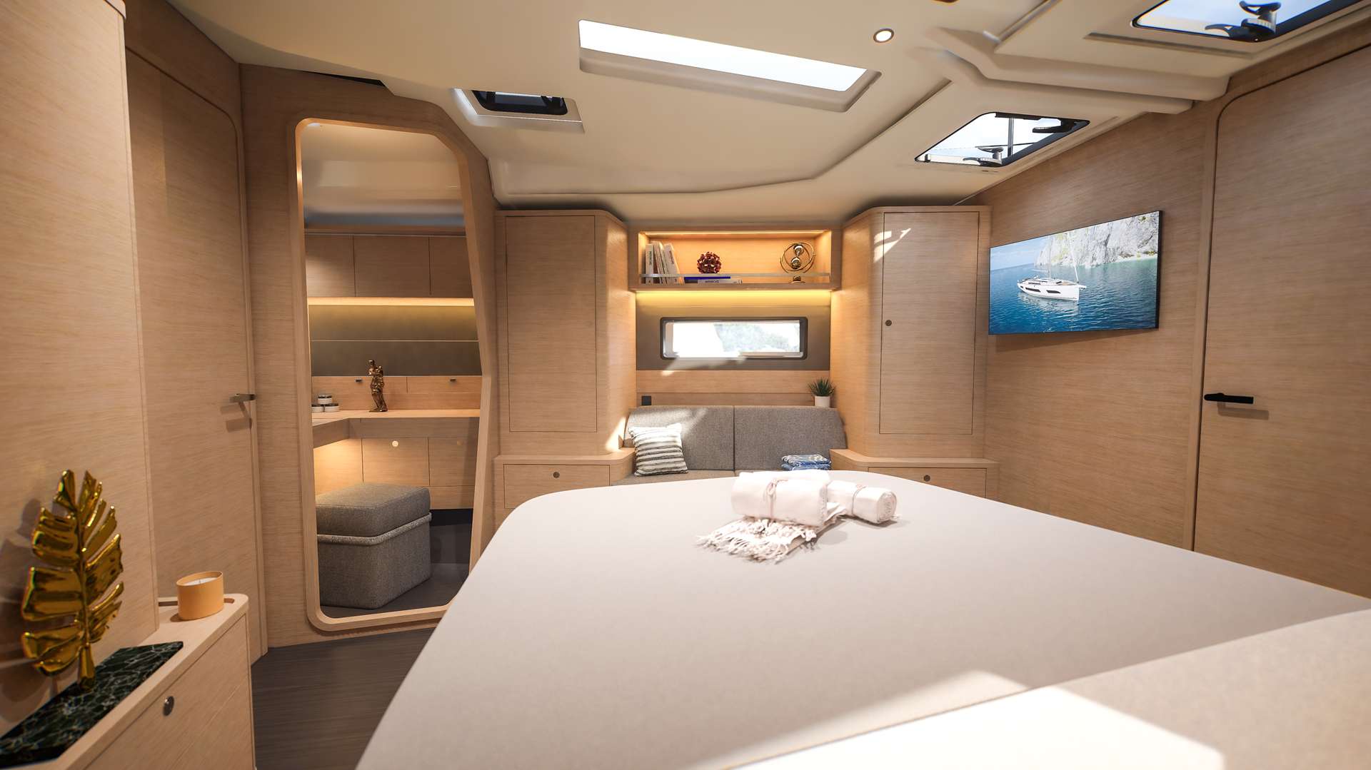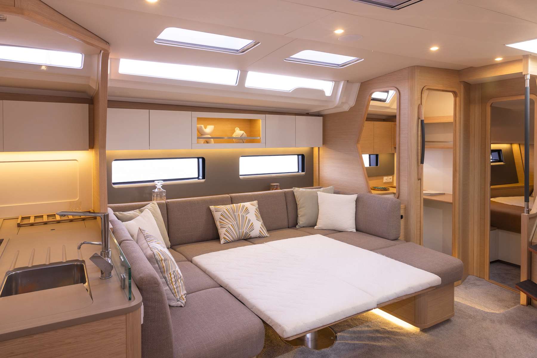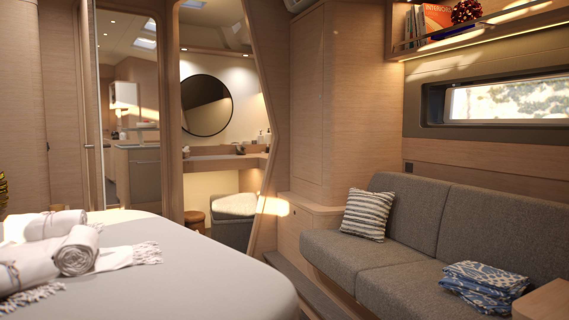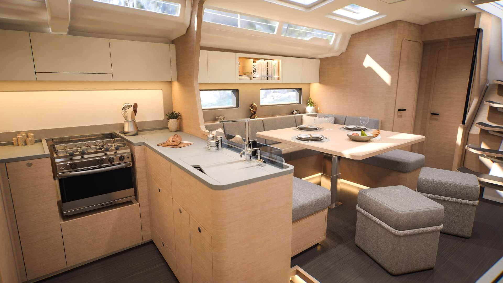 Un accent particulier a été mis sur la qualité de vie à l’extérieur avec des espaces complètement repensés pour vivre pleinement ses désirs d’escapade au grand air. Les intérieurs, eux aussi, ont été pensés pour une connexion totale avec les éléments. Les grands vitrages permettent une vue à 360° sur la mer et le ciel, où que l’on soit dans le voilier. Chaque pièce reçoit une douce et chaleureuse lumière qui rend agréables les déplacements et la vie à l’intérieur.
